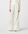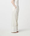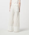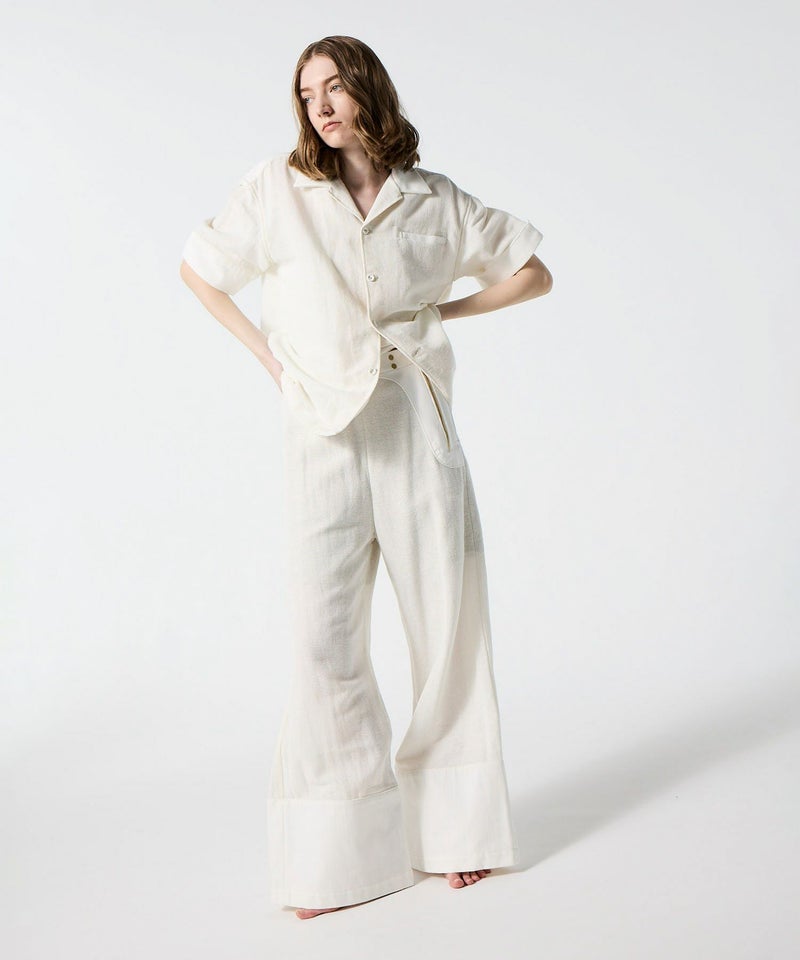 【デザイン】 デニム用の糸をデニムの織機で編みたてた絡み織を使用したワイドパンツ。メッシュのような風合いで、真夏にも最適な生地。メンズライクな開襟シャツはユニセックスでの着用も可。ヘリンボーンの生地をドッキングし、表情のあるデザインに仕上がっています。