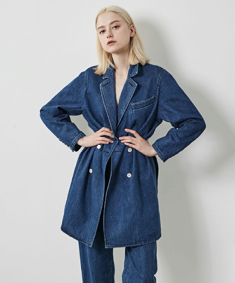 生地・縫製ともに国内で仕上げたダブルジャケット。正統派なダブルジャケットをデニム素材で表現し、ゆったりめなサイズ感と丈感がバランスの良い一着。10.5オンスのカイハラデニムを使用し、経糸緯糸ともに打込み本数を多くしてしっかりとした生地組織になっており、ハリコシ感があるような風合いが特徴です。糸はキレイな表情の色落ち感を出せるムラ感の少ないスラブ系の糸を使用。石・酵素に合わせて絶妙な色落ちをさせる特殊なストーンバイオフェード加工により、オーセンティックな見た目に表現しています。また、通常の色止め加工も施しています。