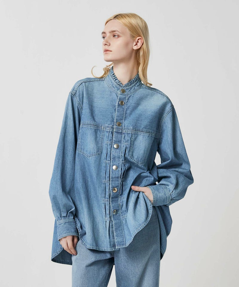 画像拡大 near. nippon FRILL COLLAR SHIRT JACKET PRICE ¥ 41,800 税込 MODEL NO. 商品番号 JDSH0124NNP-L.INDIGO COLOR LIGHT INDIGO SIZE 選択してください F 在庫切れ お気に入りに登録する 1 2 3 4 5 6 7 8 9 10+ ADD TO BAG SOLD OUT 製品について 女性らしい襟元のフリルカラーと、メンズライクなボリュームのある身頃のあえてのアンバランス感がモードに仕上げてくれるシャツ。7.25ozの軽くて柔らかい生地で、羽織としても、シャツとしても着用可能。身頃のボリューム感に合わせた大きめなシルバーのドットボタンがアクセントに。 サスティナブルポイント : エコ染色 薬剤使用低減 太陽光発電 天然ガス使用 DYEING:カイハラ(株) FABRIC:カイハラ(株) SEWING:青木被服(株)FINISHING:(株)晶栄 サイズについて サイズ 肩幅 バスト 袖丈 着丈(前身頃) 着丈(後ろ身頃) FREE 50cm 128cm 61cm 68cm 85cm 素材について 生産国:JAPAN素材:綿100%