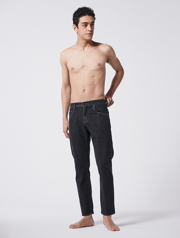 腿周りから裾にかけて程よくテーパードしており、モダンな印象に仕上げている。